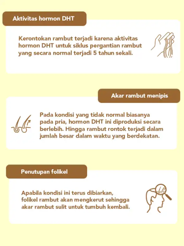 Pada dasarnya tubuh memiliki siklus pergantian rambut setiap tahun karena aktivitas hormon DHT. Namun pada kondisi hormon yang tidak normal, siklus ini terjadi berlebihan yang menyebabkan folikel rambut gagal mempertahankan akar rambut yang sehat.