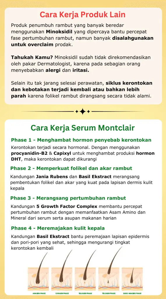 Montclair menjadi yang pertama di Indonesia sebagai serum hormonal anti DHT, dan diperkaya Growth Factor Formula, untuk hasil yang optimal dan memberikan Garansi Rambut Tumbuh.
